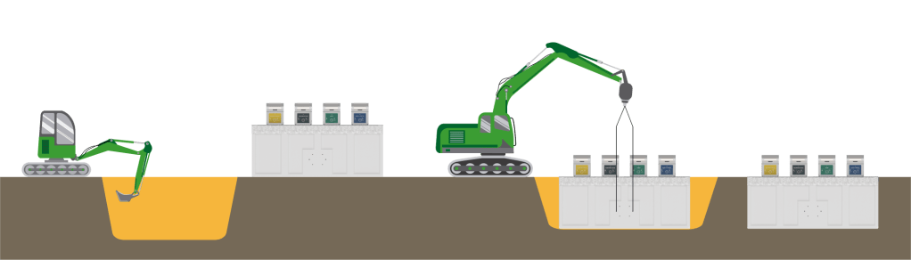 Coloanele lor mici de depozitare sunt amplasate deasupra solului, perfect integrate în spațiul urban, în timp ce containerele de depozitare sunt situate subteran, într-o platformă de ridicare.